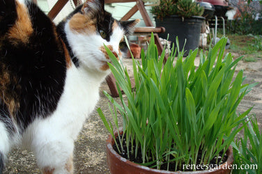 Fill a 6 inch diameter or larger, pot with moistened planting mix. Sprinkle seeds 1/4 inch apart over the surface, cover 1/2 inch deep with mix, and water gently. Keep pot moist but not soggy, and be sure to provide a good light source. The pot of grasses can be kept indoors for pets to graze on at their leisure. Fertilize every 2 weeks using a non-chemical fertilizer, such as fish emulsion.