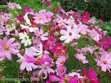 These free-flowering, long blooming summer flowers produce reliably in all soil types to fill the garden with abundant blossoms. Sow several times through June for a succession of fresh flowers. Cutting generous bouquets actually prolongs the blooming season. Cosmos pair beautifully with cleome, asters and zinnias.