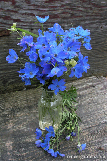 Sow Blue Mirror in early spring for mid-summer flowers the first year, late spring bloom in subsequent years. Plants can handle more summer heat than the traditional delphinium varieties. Patrol for snails and slugs on new leaves and shoots. When each flush of flower finishes, cut stalks back to plant base to encourage reblooming. Water well and fertilize regularly throughout the growing season. Plants will die back and go dormant in winter. Leave dead foliage until early spring so you know where plants are, but cut the dead branches off at first signs of new spring growth.