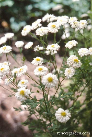 These pretty white blossoms showing just a hint of yellow at their centers will add delicacy and freshness to your mixed summer bouquets. Keep spent flowers cut for rebloom all summer. Well-drained soil is important for long-lived feverfew plants.