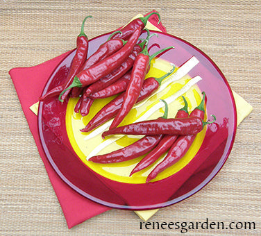 Harvest when chiles have a high gloss and are ripened to rich deep red. Use these great tasting, fiery hot chiles fresh for chile sauce or paste, making fresh salsas, in stirfries, marinades or dry and chop for spicy chile flakes. To dry for year-round use, either use a dehydrator, or harvest individually and string from the stem end to hang in a warm, airy location.