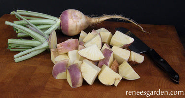 Harvest as needed when roots reach tennis ball size; pull or dig out roots carefully. Rutabagas are delicious peeled, then cut in chunks, tossed with olive oil & roasted until tender by themselves or with other root vegetables. Or slice them up to sauté gently in butter, or steam and mash.