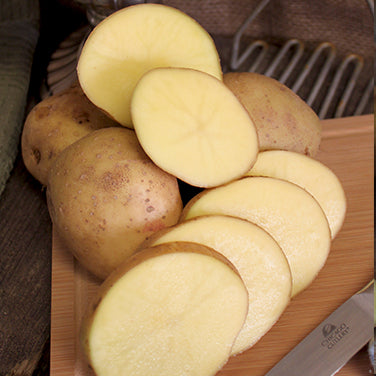 If you love yellow potatoes, you should certainly plant this fine selection bred from Yukon Gold and released in 2006. The round-oblong tubers mature about 10-12 days later than its famous parent with the same great flavor and delicious moist yellow flesh, but Yukon Gem offers more reliable and higher yields than Yukon Gold, as well as improved resistance to PVY, common scab, blight (early and late) and black spot.