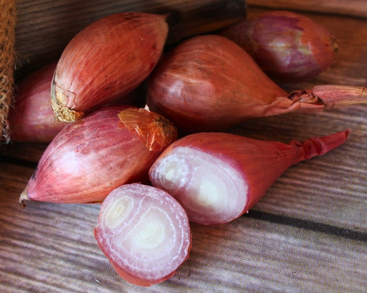 Red Shallots reliably produce plump, juicy, teardrop shaped red-skinned bulbs with shiny, coppery-red skins and white flesh with faint red rings. They have a delicious sweet, nutty flavor that shines when sauteed in butter or olive oil, caramelizes beautifully, and they will cook down to add subtle notes that enhance every dish without ever dominating it. Red shallots are nice in cooking with wine and/or a great addition to homemade vinaigrette. These are long keepers: Stores 6-9 months