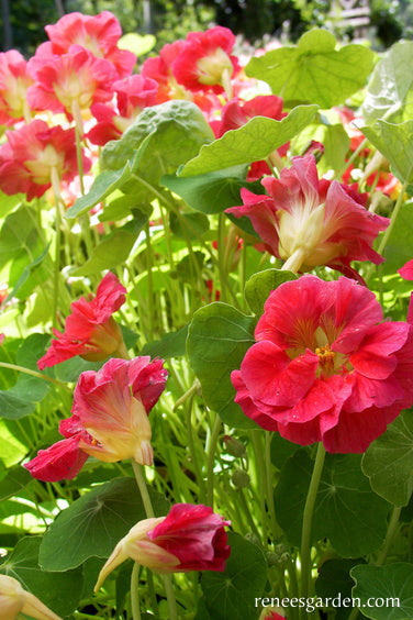 Climbing nasturtiums are very reliable and easy to grow in any well-drained soil. Help them to twine up their supports, then they’ll climb easily and bloom non-stop. Do not let plants dry out during blooming season. You can also plant Amazon Jewel to tumble along the ground.