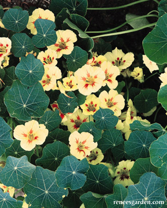 These softly colored, intricately marked nasturtiums are reliable and easy to tuck into any well-drained spot. Except in very poor soil, nasturtiums will grow and bloom readily with no added fertilizer. The mounding plants do a fine job of covering bare spots or hiding spent bulb foliage. Use the pretty edible flowers and leaves to add zest to salads and party sandwiches.