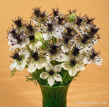 Sow seeds directly into a finely textured, well-drained garden bed as early in spring as the ground can be worked. Space seeds 2 inches apart, in rows 6 inches apart. Cover seed very lightly, about 1/4 inch deep. Or broadcast seeds evenly over the seed bed and cover very lightly. Keep evenly moist while awaiting germination. Thin seedlings to stand 6 inches apart so plants have room to grow and mature. In mild winter climates, Nigella can be sown in early spring and also be sown again in cool fall weather to overwinter for spring bloom.