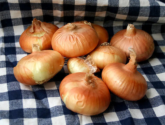 This handsome, bronze-skinned hybrid onion grows successfully just about all over the country and it's the perfect onion to try if you haven't grown them before. All-purpose Candy produces big, softball sized, globe-shaped onions, with a mild onion flavor and firm crispy yellow flesh that is delicious raw or cooked. Candy onions caramelize beautifully when chopped and sautéed.