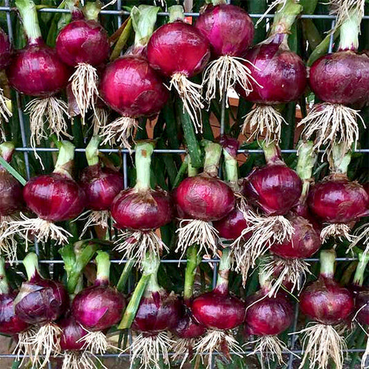 Redwing onions have dense, solid slightly pungent flesh. String up a bunch to grace your kitchen until needed. After harvest, these beauties continue to develop internal deep purple color and store well so you can use them for 6 to 8 months.
