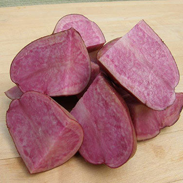 Terra Rosa is a full-sized, oblong variety with smooth, deep magenta skin and pink-red sweet, creamy flesh that ranks high for flavor. This high nutrient specialty potato is really handsome, but its good looks are not just skin deep, because Terra Rosa’s rich color means higher levels of bioactive antioxidants and protective carotenoids. They retain their rosy color and resist fading when cooked.