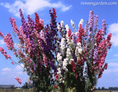 Sow seed early when weather is still cool to get sturdy plants that will provide many weeks of bloom. Cut flowering stalks before individual florets begin to drop for graceful indoor bouquets, or air-dry indoors for everlasting arrangements. Larkspur will continue to bloom well into summer if faded flowers are removed.