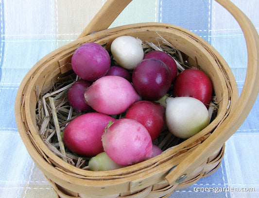 Harvest these sweet baby turnips from when they are as big as walnuts to when they are the size of ping-pong balls. If weather turns unexpectedly hot, pull and store the roots in the refrigerator. Turnips will be spicier in hot weather. Pearly white baby turnips are delicious sliced raw into green salads, or you can steam or sauté them briefly, or toss in oil and roast whole to bring out their natural sugars. Enjoy the tasty, nutritious green tops steamed or quickly braised.Regular price $4.69Sale price $4.69Unit price / per -