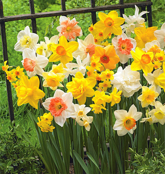 A splendid mix to delight you as it unfolds in all possible daffodil colors and shapes, both familiar and unusual and rare forms, including both new varieties, old friends and beloved heirlooms. Begins flowering in early spring at the very beginning of the daffodil season, and then continues for weeks until the end. Selected for especially to naturalize happily and return each season. Contains a wide assortment of Large Cupped, Small Cupped, Double, Jonquilla, Trumpets, Triandrus, Poeticus, Split-Cup and Cyclamineus bulbs (Royal Horticultural Society Divisions 1, 2, 3, 4, 5, 6, 7, 9 and 11) Blooms April and May. 16 to 20 inches tall.