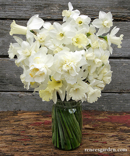 Mix includes: Trumpet Daffodil Mount Hood, Large Cupped Narcissus Stainless, Double Narcissi Cheerfulness and White Medal, Triandrus Narcissus Thalia, Jonquilla Narcissus Pueblo and Small Cupped Princess Zaide. Some cups open yellow and then mature to a rich ivory. (Royal Horticultural Society Divisions 1, 2, 3, 4, 5 and 7). Blooms April and May. 16 to 20 inches tall.