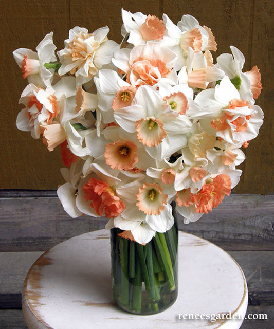Our entrancing “pink” mix of daffodils have ivory or cream petals with cups or cup edges tinted in dainty shades of salmon, peach and apricot that deepen into pinky rose shades as the flowers mature. These lovely flowers set each other off in both the garden and as cut flowers for the vase display. You’ll have Large Cupped Accent, Passionale, Pink Charm, Precocious, Salome, Sophie Girl and Spring Pride, Double Delnashaugh and Jonquilla Bell Song, plus other selections. For best color development, plant them in filtered sunlight. This blend makes a stunning display. (Royal Horticultural Society Divisions 2, 4, and 7). Blooms April and May. 16 to 20 inches tall.