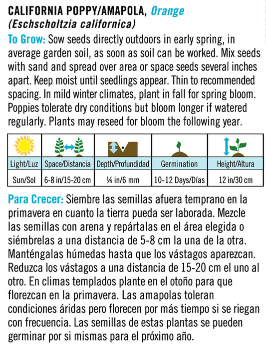 State Flower of California. Water wise and tolerant of poor soil, California poppies have feathery blue-green foliage and silky, bright orange flowers on sturdy stems. Reseeds in milder climates.Regular price $2.19Sale price $2.19Unit price / per -