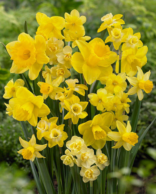 Mix includes: Trumpet Arkle, Dutch Master, Marieke and Rijnveld's Early Sensation, Large Cupped Avalon and Camelot, Jonquilla Trevithian, and Double Narcissus Yellow Cheerfulness. (Royal Horticultural Society Divisions 1, 2, 4 and 7). Blooms April and May. 14-20 inches tall.