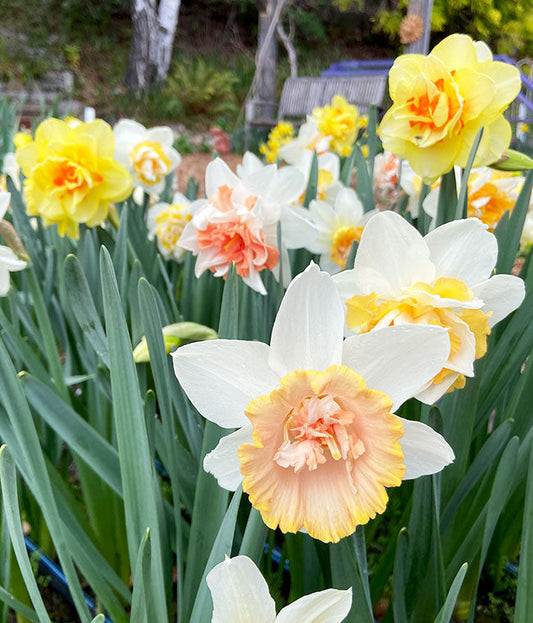 For an eye-catching and truly stunning spring display, it’s hard to beat the gorgeous big blooms of our Giant Double Mix. Each flower has multiple layers of ruffled petals or crowns that will remind you of opulent roses or small peonies!