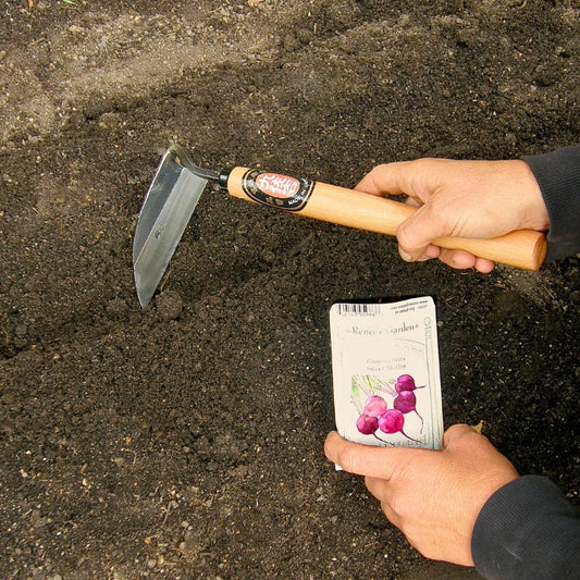 You’ll find the convenient inch marking on its blade invaluable for sowing seeds at just the right depth. The tool easily digs out deep tap roots and the blade’s serrated edge literally scrapes weeds right out of the soil. Better than any trowel, the Hori Hori is perfect to dig holes, cut sod and divide perennials. When harvesting, it cleanly pops out root vegetables like potatoes and beets or cuts squash and pumpkins from the vine.