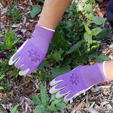 We offer Small, Medium and Large gloves in four bright colors that make them easy to spot in the garden: Pink, Orange, Purple and Green.