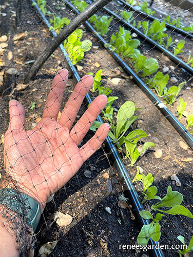 Simply stretch the bird netting tautly over supports to hold it above the seedlings. We recommend using pliable irrigation tubing (aka poly tubing) bent into hoops over the bed so it holds the netting securely 12-15 inches above the plants. Even if birds land on it, they won’t be able to push it down and peck at your plants.