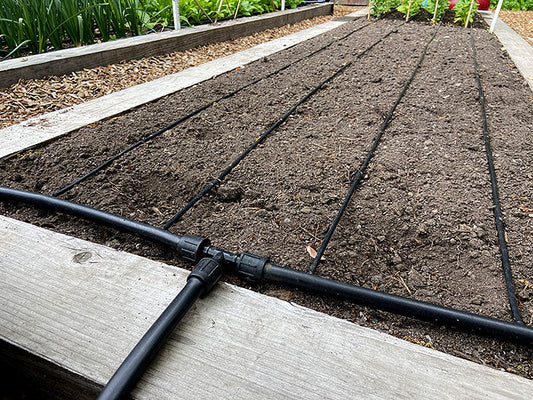 Even longtime gardeners can be intimidated by drip irrigation systems, but this well-made kit is the answer; it is truly a one-stop solution for watering! Everything you need for installing drip irrigation in two to three 4’ x 8’ raised beds is included.
