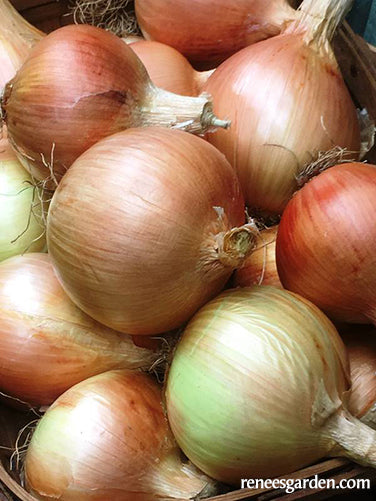 Harvest midsummer when bulbs are sized up and about half the onion tops are bent over. Stop watering and bend the rest of the tops down. After another 7 to 10 days or when tops are dry, pull the bulbs. If possible, let the onions dry in the sun for 5 to 7 days. Store bulbs in a cool, airy place.