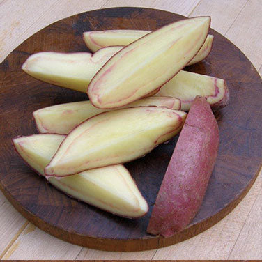 This delicious heirloom, first imported from France in the 1950s, is a longtime favorite of restaurant chefs. French Fingerlings have attractive rosy-red smooth and tender skin, rich yellow flesh streaked with red and exquisite flavor. The flesh of this gourmet fingerling looks already buttered and its fine flavor is sweet and nutty, with a dense texture. Their thin skin is very edible and needn’t be removed before eating. The elongated oval tubers size up from 3 to 4 in. long.