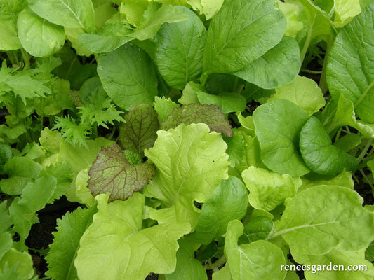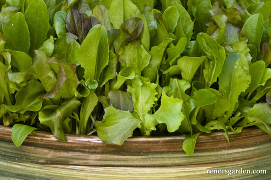 To harvest by the “cut and come again” method, wait until plants are 4 to 6 inches tall. Cut as much as you need, using scissors to shear off a patch of leaves about 1 to 2 inches above the soil level. Water well and fertilize lightly and plants will regrow for several more cuttings. Dress with a simple vinaigrette to enjoy the sweet flavor and juicy texture of these delicate young leaves at their best. For this Asian mix, try using rice vinegar and a touch of soy sauce and garlic in your vinaigrette.