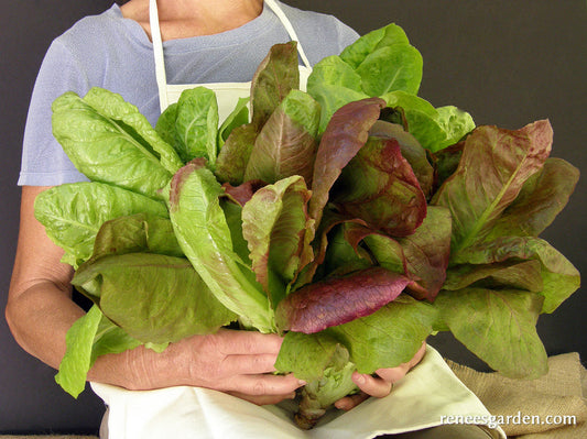 Savor young thinnings in your first spring salads. Then harvest plants by cutting mature heads when they feel firm and well-filled out. Pull and discard or compost over-mature plants if they begin to elongate (“bolt”) in hot weather as they are bitter at this stage. These crispy colorful romaines are perfect for centerpiece Caesar salads that rival the finest restaurant. Use top quality ingredients to make dressing, or you can find my favorite recipe on our website: reneesgarden.com/recipes