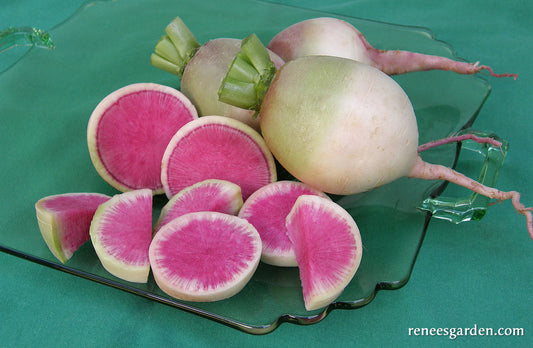 For best quality, harvest watermelon radishes promptly when sized up 2 to 4 inches in diameter. Note: Interior flesh becomes rosy red when roots are fully mature. Their flavor will be milder and sweeter harvested in cool fall weather. These roots will keep their eating quality for weeks in your refrigerator. For a beautiful and colorful salad, make a plate of very thinly sliced watermelon radishes sprinkled with oil and rice wine vinegar or fresh lemon juice and chopped scallions.Regular price $3.99Sale price $3.99Unit price / per -