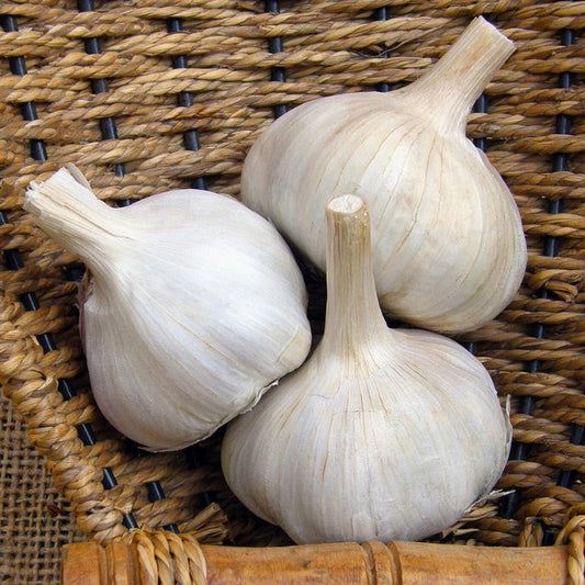 Hardneck German Porcelain garlic produces impressively large bulbs, up to 3 inches in diameter, with thick, translucent white wrapper leaves. Inside you’ll find 4 to 6 very large, juicy, easy to peel cloves.