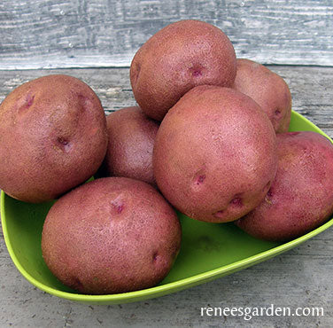 These large, rounded potatoes have deep red, almost burgundy colored skins and contrasting bright white flesh. A good choice when you want to dig some early for little red skinned baby potatoes, then leave the plants to produce full-size potatoes for later harvest.