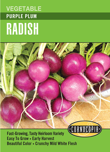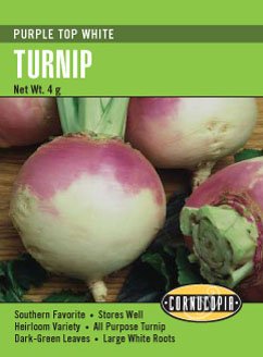Large, round roots are creamy white with purple tops and mild, sweet flavor that’s great for fresh eating or cooked in soups and stews. Leafy tops make tasty greens.