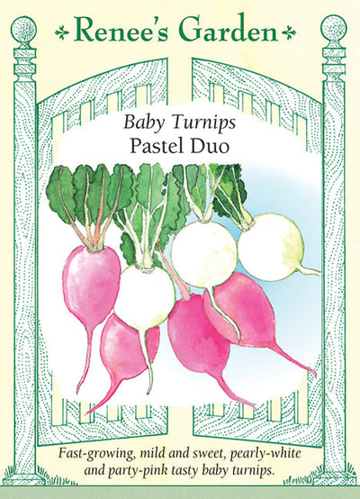 EXCLUSIVE – Imported from Japan, these pretty globe-shaped baby turnips are a special gardener’s treat. We’ve combined seeds for pearly white and party pink little turnips, both with crispy white flesh and delicious mild, sweet flavor. No need to peel; just slice up to enjoy in salads or as crunchy snacks on their own. Or use quickly stir-fried. The tasty, nutritious tops make fine sautéed greens. Plant fast-growing baby turnips both in cool spring and fall weather.