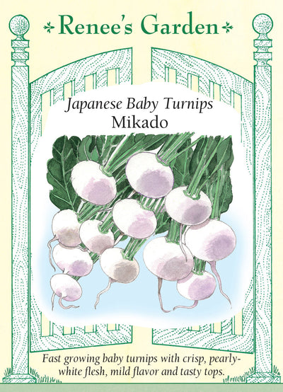 Sourced from Japan especially for us, these quick growing, pretty little globe-shaped roots have crisp, pearly-white flesh. Enjoy their mild flavor sliced up raw for green salads and crunchy snacks or quickly stirfry, sauté or roast them whole in the oven – they cook in minutes. Mikado’s tasty and nutritious tops make fine cooked greens. These baby turnips are a spring garden treasure that you can happily sow again in late summer for abundant fall harvests.
